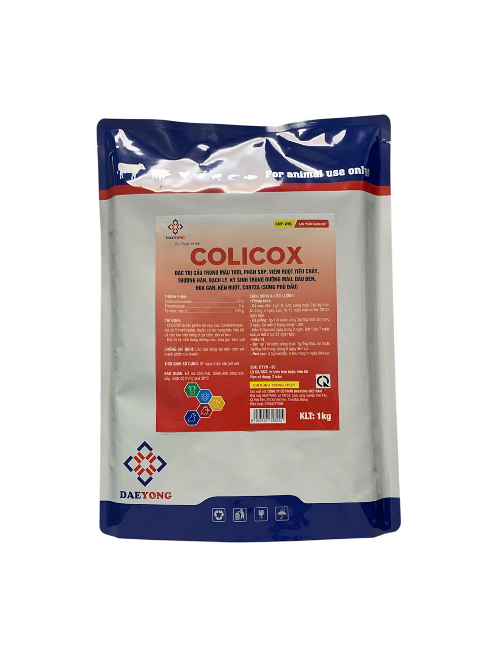 - COLICOX là sản phẩm kết hợp của Sulfamethoxaz-ole và Trimethoprim, thuốc có tác dụng hữu hiệu tất cả các loại cầu trùng ở gia cầm , thỏ và heo.