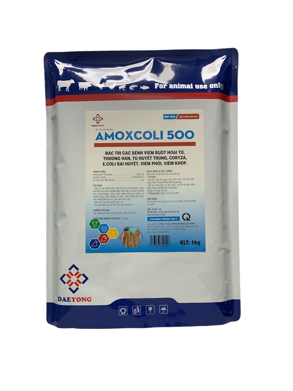 - Đặc trị các bệnh viêm ruột hoại tử (Clostridium), sưng phù đầu (Coryza), chướng diều, khô chân, sã cánh, thương hàn(Salmonella), phân xanh, phân trắng do E.coli, tụ huyết trùng, viêm đường hô hấp, viêm đường tiết niệu,viêm khớp trên gia súc, gia cầm, thuỷ cầm.